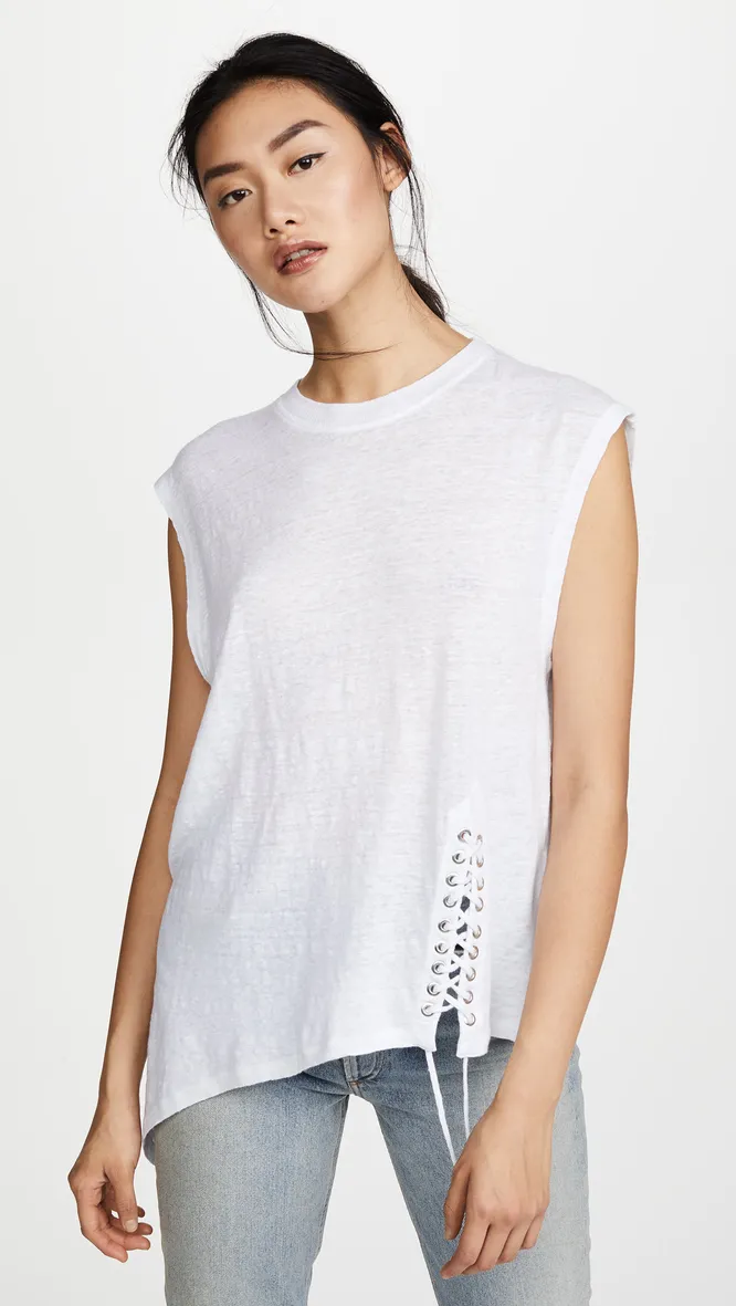 Майка асимметричного кроя с завязками выглядит стильно и оригинально. На наш взгляд, она идеально впишется в образ в стиле grunge, поэтому рекомендуем носить ее с узкими черными джинсами, ботинками и необычными кроссовками.