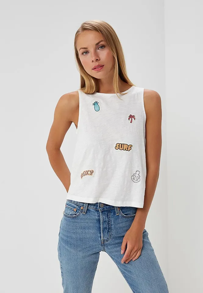 Укороченную майку с нашивками носи с модными «мамиными» джинсами, кроссовками и трендовой сумкой на поясе.