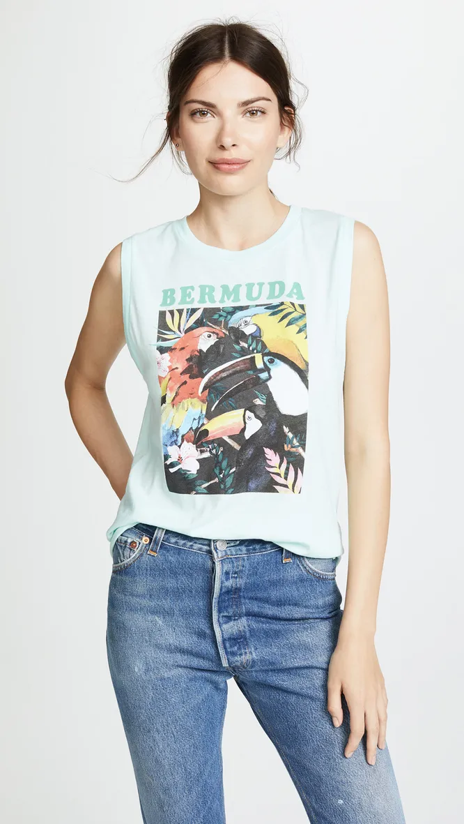 Модель с гавайским принтом носи на пляже с джинсовыми шортами с высокой талией и эспадрильями.