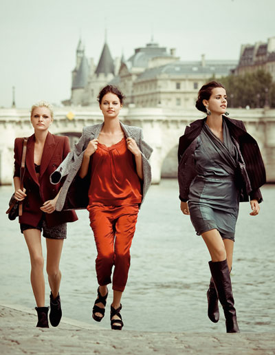 НА ДАШЕ: жакет, Jean Paul Gaultier; шорты, Andrea Crews; бюстье, Serge; ботинки, La Boté Gardiane; сумка, Cotélac. НА ИРЕ: жакет, BGN; блузка, Ril’s, брюки, by Malene Birger. НА ДАЙАНЕ: жакет, Kenzo; платье, серьги, by Malene Birger; сапоги, Baldinini
