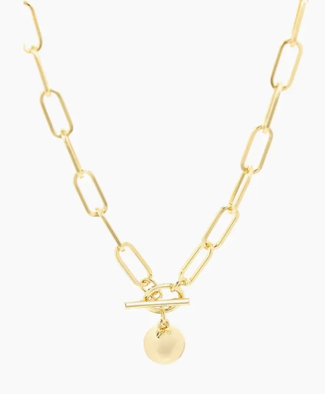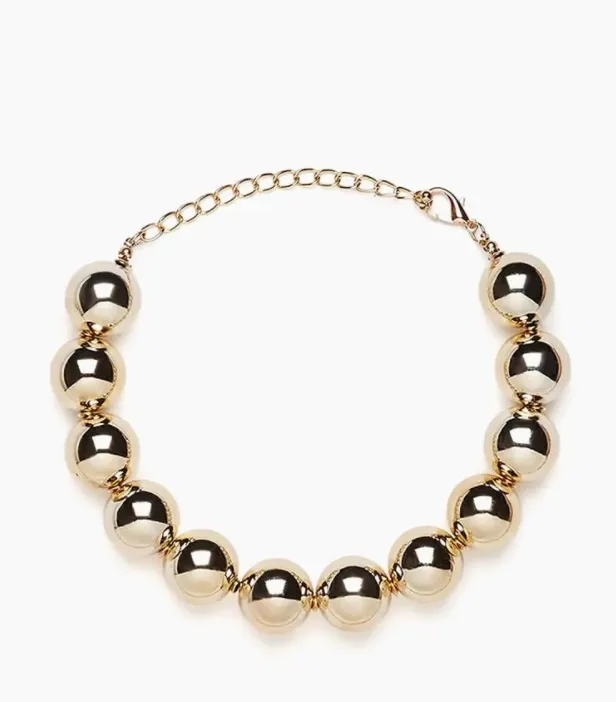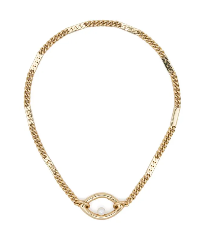Если хочешь примерить на себя модный тренд на цепи, то обрати внимание на лаконичное золотистое колье из крупных цепочных звеньев, дополненное аккуратной бусиной. Украшение поможет преобразить повседневные луки и добавит им немного остроты.