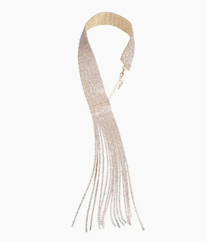 Роскошное колье в стразах с «бахромой» — идеальное дополнение к вечерним платьям и топам с глубокими вырезами. Причем его можно носить не только на груди, но и на спине. Чтобы добавить образу еще большей эффектности, дополни колье мерцающими серьгами-подвесками и массивными кольцами.