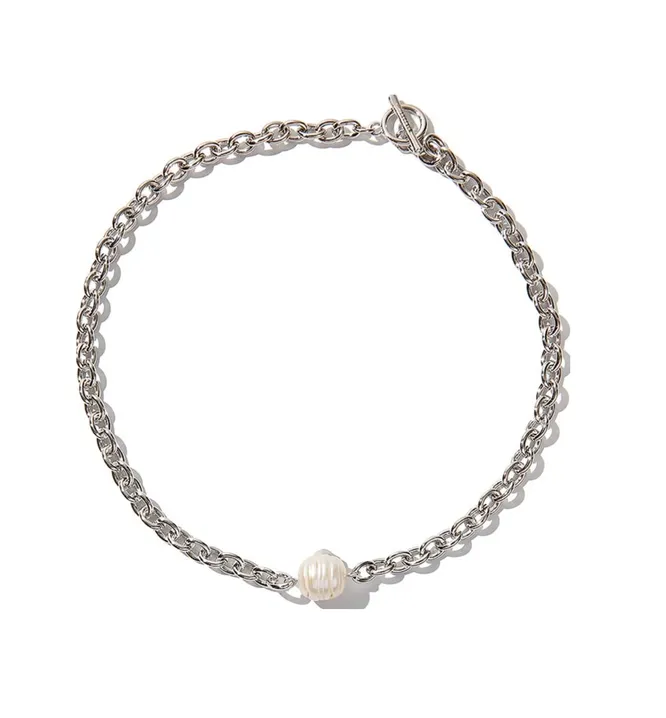 Серебристое колье с жемчужиной – украшение, которое одновременно сочетает в себе нотки гранжа и элегантности. Оно отлично впишется как в женственные образы с летящими платьями, так и в луки с рваными джинсами, кедами и грубыми кожаными куртками. При желании его можно дополнить парой тонких серебристых цепочек, многослойными браслетами и акцентными кольцами.