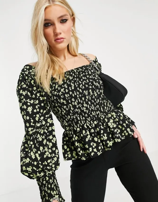 К этой блузе можно подобрать юбку с похожим цветочным узором, брюки с принтом «зебра» или выбрать нейтральный однотонный низ.