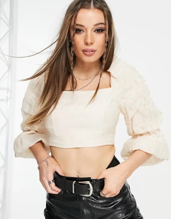Для вечерних аутфитов выбирай укороченную фактурную блузу с объемными рукавами.