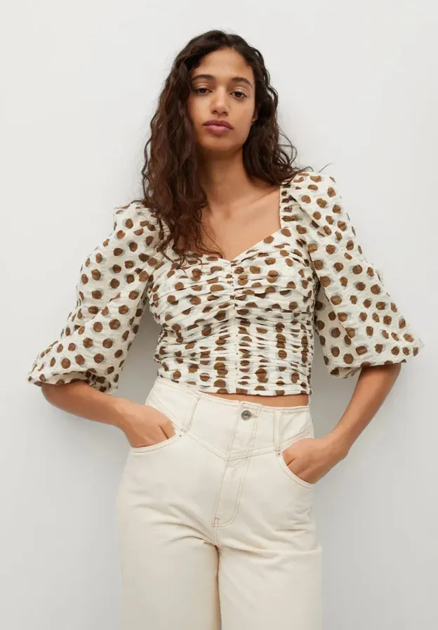 Более сдержанная модель — блуза в мелкий горошек. Носи ее с узкими джинсами, широкими шортами или однотонной юбкой.
