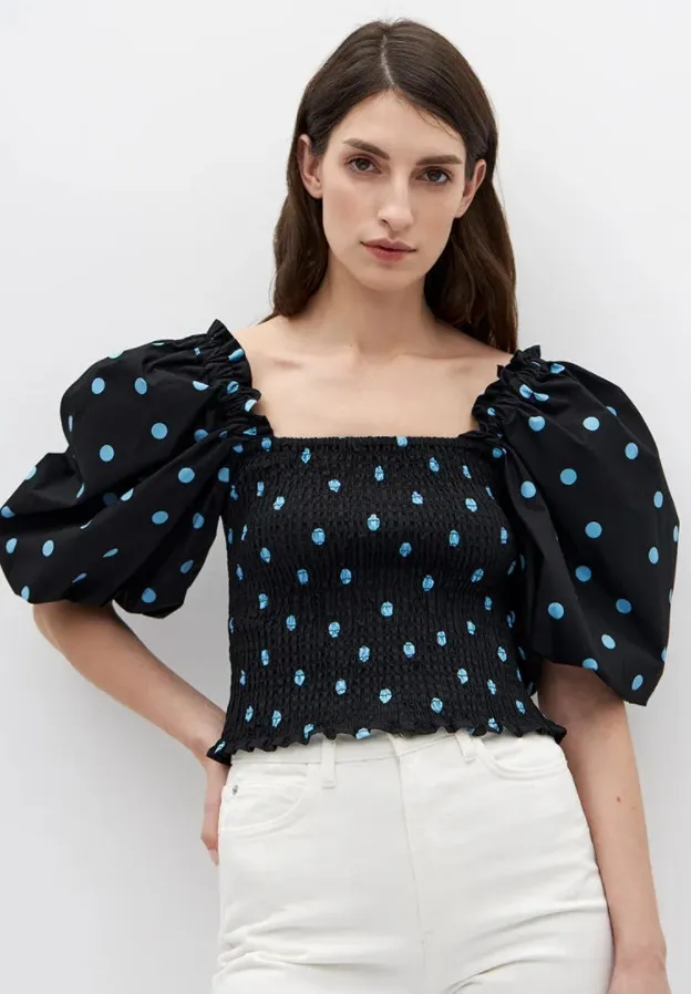Воздушная блуза в горох с объемными рукавами и сборками на груди станет отличной основой для выразительных романтичных луков. Можно дополнить ее брюками-бананами или юбкой А-силуэта.