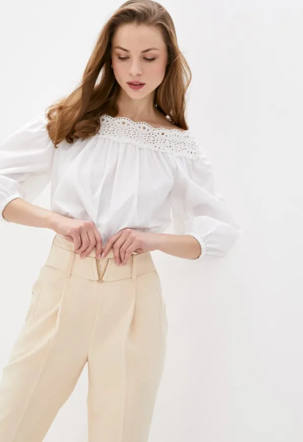 Отличная альтернатива белой рубашке — блузка с открытыми плечами, декорированная кружевом ришелье.