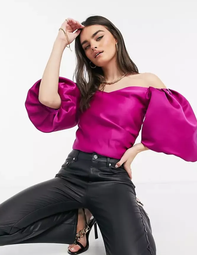 Для эффектных вечерних образов выбирай блузу с рукавами-буфами цвета фуксии. Можно носить ее с кожаной мини-юбкой или струящимися брюками палаццо.