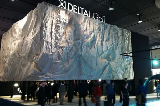 Мы применили его для создания декораций с мэппингом: нужно было построить гигантскую стену длиной 120 метров и высотой 14 метров, полностью изогнутую, чтобы воссоздать подводный мир для показа Philipp Plein. Вся работа выполнялась вручную, каждая складка формировалась вручную — это был настоящий вызов. Монтаж занял больше двух недель, потому что требовалась ювелирная точность и огромные объемы материала: на каждый изгиб уходило в три раза больше полотна, чем в прямой конструкции.