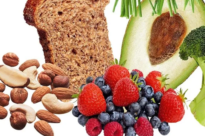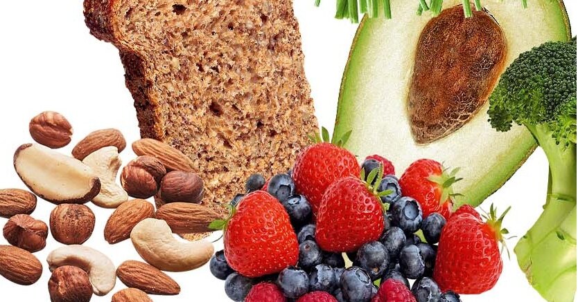 цельнозерновой хлеб и паста, овсянка, коричневый рис, орехи, ягоды, брокколи, морковь, картофель, лосось, авокадо, яблоки, помидоры.