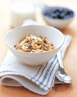 - В 3/4 чашки смеси добавь 1-2 ложки домашнего обезжиренного йогурта и молоко (соевое или коровье).