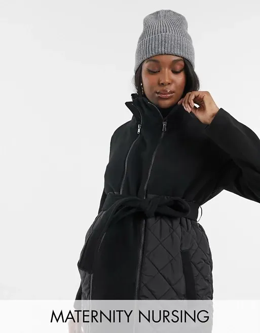 Зимняя верхняя одежда для беременных имеет высокий воротник и прочные застежки, чтобы холодная погода не повлияла на здоровье будущей мамы. У пальто со стегаными элементами съемный тканевый пояс — им всегда можно подчеркнуть животик, при этом не испытывая дискомфорт. Его можно носить и после беременности, качественная ткань не износится за несколько месяцев. У пальто вместительные боковые карманы и классическая посадка, поэтому такой вариант даже не успеет выйти из моды.