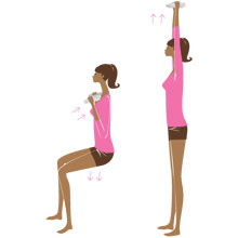 На вдохе колени согни до угла 90 градусов, на выдохе вернись в и.п., одновременно поднимая прямые руки с бутылками.
