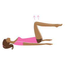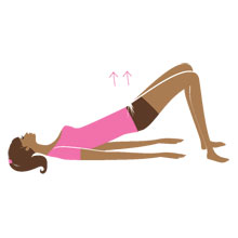 На выдохе, напрягая мышцы пресса, подними таз на несколько сантиметров от пола, на вдохе плавно вернись в и.п.