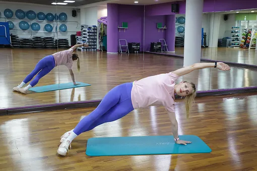 Исходное положение — лежа на боку с опорой на ладонь, стопы на одной линии. На выдох — оттолкнись ладонью и поднимитесь в планку, слегка напрягая живот и вытягиваясь за за свободной рукой. Дай себе хорошую опору в ноги, чтобы не перегружать плечо и запястье. По 8-10 повторений с каждой стороны заставят включиться в работу все тело.