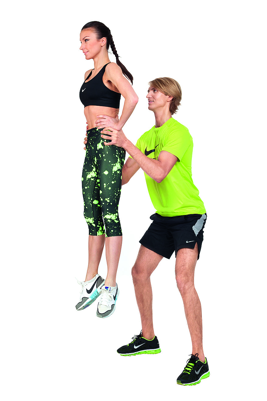 Пусть твой мужчина встанет сзади и обхватит тебя за талию. Приседайте вместе, при выходе из приседания ты отталкиваешься от пола, а он максимально поднимает тебя вверх.
