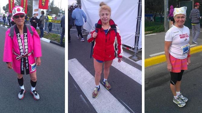 Этот год не стал исключением: все желающие могли запастись углеводами перед забегом или, наоборот, скинуть лишнее на финальной танцевальной разминке. На «макаронную вечеринку», где также можно получить свой номер и фирменную майку марафона, приглашаются все участники независимо от дистанции, которых в рамках марафона несколько. Первая — классическая марафонская дистанция в 42 километра. Несмотря на всю серьезность этой дистанции, одолеть ее берется множество любителей, причем самых разных возрастов. Встретить пожилого бегуна на старте — не редкость (на фото — участники из Японии, России и Финляндии соответственно). И что самое приятное, среди марафонских ветеранов есть и наши соотечественники. Что же касается почетных гостей, то в этом году марафон одолела Аннализа Минетти, знаменитая слепая итальянская певица и «Мисс Италия — 97».