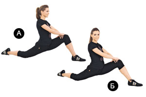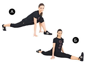 Исходное положение: глубокий выпад на левую ногу, упор ладонями в пол. Очень медленно правой ногой начни движение назад, скользя носком по полу и постепенно перенося вес тела с левой ноги на правую. Не торопись! И не стремись сразу же сесть на шпагат! Аккуратно попружинь в максимально низкой для тебя точке. Вернись в исходное положение. Повтори с другой ноги.