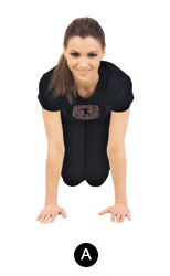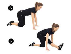 Исходное положение: стоя на четвереньках. Правую ногу вытяни вперед, перенеси вес тела на левую, упор на ладони. Потяни носок правой ноги на себя, наклоняясь животом к бедру. И с другой ноги.