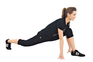 Исходное положение: глубокий выпад на левую ногу. Спина прямая, ладони упираются в пол. С небольшим усилием и покачиванием растягиваем заднюю поверхность бедра и ягодичную мышцу. Не спеши! Выполни с другой ноги.