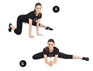 Исходное положение: стоя на четвереньках. Перенеси тяжесть тела на руки, вытяни левую ногу в сторону. Правая нога согнута в колене. Теперь, медленно скользя по полу, начни опускаться глубже. Делай все с усилием. Прочувствуй, какие группы мышц работают. Повтори с другой ноги.