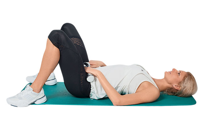 ИП: лежа на спине, ноги согнуты в коленях. Положи гантели на область внизу живота.