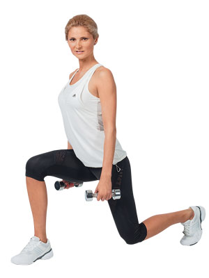 ИП: стоя, правая нога впереди, левая – на мыске сзади, в руках – гантели. Выполни приседание (угол в коленных суставах – 90 градусов!), вернись в ИП. Повтори 15 раз. Это составит 1 подход. Выполни по 3 подхода на каждую ногу. Отдых между подходами – 2 минуты.