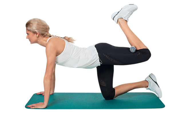 ИП: стоя на четвереньках, упор на руки (ладони направлены вперед) и колени. Зажми гантель между бедром и голенью ноги, приподними утяжеленную ногу вверх.