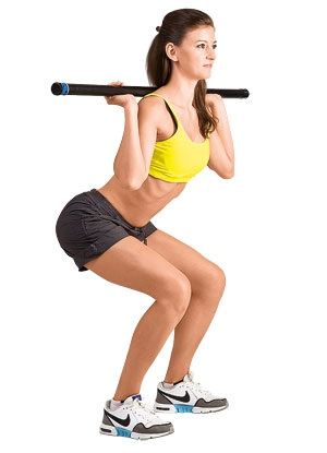 ![]() | 4. Приседания ТРЕНИРУЕМ ПЕРЕДНЮЮ ПОВЕРХНОСТЬ БЕДРА И ЯГОДИЦЫ ИП: стоя, стопы на ширине таза, колени слегка согнуты, мышцы живота напряжены, спина прямая, лопатки сведены. Бодибар на плечах. На вдохе выполни приседание (угол в коленных суставах – 900): отведи таз назад, напряги мышцы ягодиц. На выдохе вернись в ИП. |