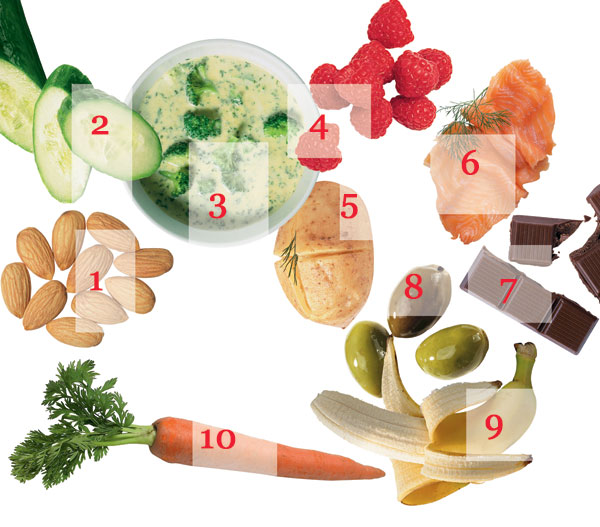 | 13 НЕСОЛЕНЫХ ОРЕШКОВ МИНДАЛЯ Кладезь полезных жиров, витамина В и кальция. БОНУС: миндаль отлично тонизирует – будешь бодрой целый день! 11 ОГУРЦОВ И СТОЛОВАЯ ЛОЖКА ХУМУСА (пюре из турецкого гороха) Оптимальное соотношение кальция, цинка и протеина. БОНУС: идеально здоровые и крепкие ногти. ТАРЕЛКА СУПА-ПЮРЕ ИЗ БРОККОЛИ В брокколи полным-полно магния, который нормализует работу нервной системы и стимулирует деятельность мозга. БОНУС: первый помощник во время рабочего аврала и сдачи сессии. ГОРСТКА МАЛИНЫ В малине невероятное количество ацетилсалициловой кислоты. То есть банального аспирина. БОНУС: и голова ни о чем болеть не будет! 1 ПЕЧЕНАЯ КАРТОШКА В ней есть регуляторы обмена веществ, которые снижают уровень холестерина и помогают худеть. БОНУС: нормализует пищеварение. ЗЕРНОВОЙ ХЛЕБЕЦ С ЛОСОСЕМ Такой бутерброд быстро вернет тебя к жизни, придав сил. БОНУС: получаешь сразу и полезные «медленные» углеводы, и протеин. 2 КВАДРАТИКА ЧЕРНОГО ШОКОЛАДА Антиоксиданты, содержащиеся в масле какао, заставят иммунную систему работать в полную силу. БОНУС: не заболеешь! 25 ОЛИВОК Богаты насыщенными жирными кислотами, которые снижают холестерин. БОНУС: активно борются с лишним весом и дряблой кожей. БАНАН Главный источник серотонина (тот самый «гормон счастья») и фосфора, помогающего думать. БОНУС: банановый аромат подавляет аппетит. 9 МОРКОВОК С МАСЛОМ Легко усваиваемый каротин. Полезен при акне и близорукости. БОНУС: хорошее зрение, чистая кожа и блестящие волосы. |