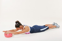 | Исходное положение: лежа на животе, руки вытянуты над головой и лежат на мяче. Выдох – надавливая руками на мяч, отведи плечи и лопатки к пояснице, подними корпус над полом. Втягивая живот, потянись грудью! Вдох – вернись в исходное положение. |
