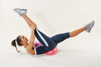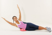 | Исходное положение: лежа боком на мяче, руки вытянуты над головой. Выдох – потянись, приподними корпус и руки над полом. Держи равновесие, помогая себе мышцами ягодиц и ног. Вдох – вернись в исходное положение. И в другую сторону! |