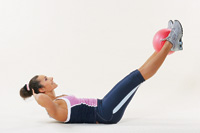 | Исходное положение: лежа на спине, руки за головой, корпус приподнят, ноги согнуты, мяч зажат стопами. Выдох – сдавливая мяч, выпрями ноги под углом в 45 градусов. Втяни живот, ощути, как тянется все тело. Вдох – исходное положение. |