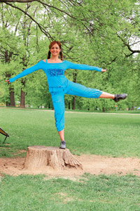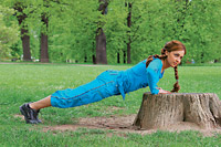Исходное положение: стоя боком к пеньку (скамейке, лестнице, бордюру). Раз – встань на пень одной ногой. Два – другую ногу отведи в сторону. Спина прямая, живот втянут, стопу отведенной ноги тяни на себя. Три, четыре – вернись в исходное положение. Повтори с другой ноги.