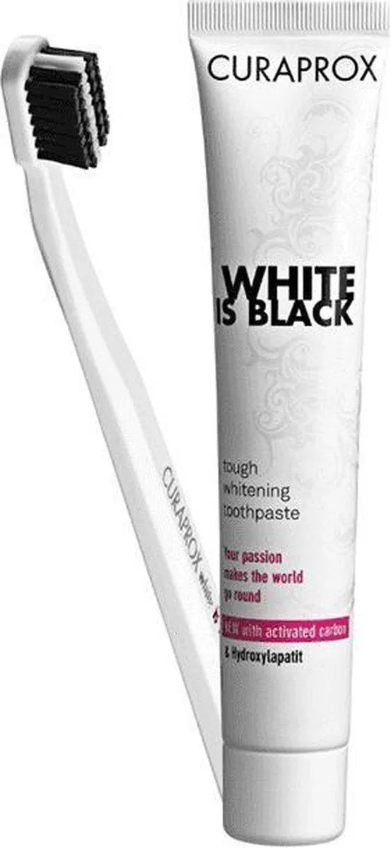 В комплекте с пастой идет очень мягкая, удобная щетка с длинными щетинками, которые эффективно убирают налет даже из самых труднодоступных мест. Активная формула включает активированный уголь, который быстро и безопасно осветляет зубы, не повреждая при этом эмаль. Гидроксиапатит, обладающий схожим действием, снимает воспаление с десен, укрепляет их.