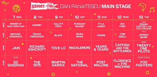 Крупнейший европейский фестиваль музыки и искусства Sziget, который в этом году пройдет с 7 по 13 августа в Будапеште, анонсировал новые имена главной сцены мероприятия. В течение семи дней на ней выступят Эд Ширан, The 1975, Мартин Гаррикс, The National, Post Malone, Florence + The Machine, Foo Fighters, Twenty One Pilots. К ним также присоединятся 6LACK, Tove Lo, Macklemore, Years & Years, IDLES, Jungle и многие другие. На 60 площадках по территории фестиваля пройдет более 1000 развлекательных программ.