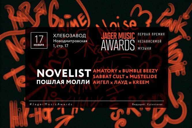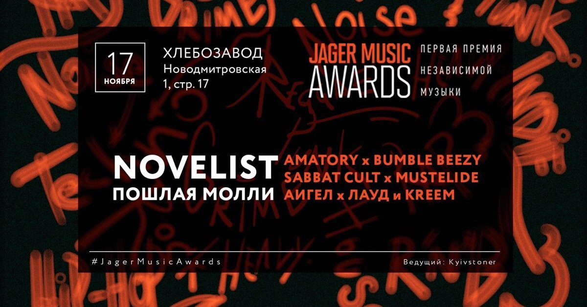 Хедлайнер мероприятия — британский эмси Novelist, король грайма из южного Лондона, соратник электронных продюсеров Jamie xx, Baauer и Skepta, чьи живые концерты задали новую планку музыкального безумия. Начав карьеру с эфиров на пиратских радиостанциях, Коджо Канкам быстро дорвался до выступлений на одной сцене с Major Lazer и контракта с культовым английским лейблом XL Recordings. Его лайв в рамках Jagermeister Music Awards станет премьерным выступлением в России и финальной точкой церемонии.