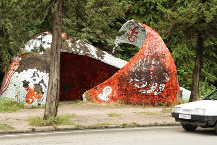 Автор фото, девушка по имени Саднила, сообщила, что остановки в Абхазии делал сам Зураб Церетели, потому они такие торжественные и монументальные.