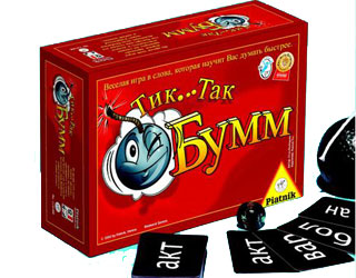 ![]() | «Тик-так-бум» — самая простая из этих игр – в ней нужно передавая по кругу тикающий муляж бомбы придумывать слова, содержащие какой-то конкретный слог. Например, «Мет» — это и «метро», и «металл», и «сметана». Тиканье бомбы вносит в игру мандраж, спешку – игроки входят в ступор, что само по себе уже забавно. Так ведь еще можно соседа обмануть – передать ему бомбу, назвав неподходящее слово. Если он бомбу взял – вернуть назад уже нельзя. Хорошо для игры в 6-8 человек.