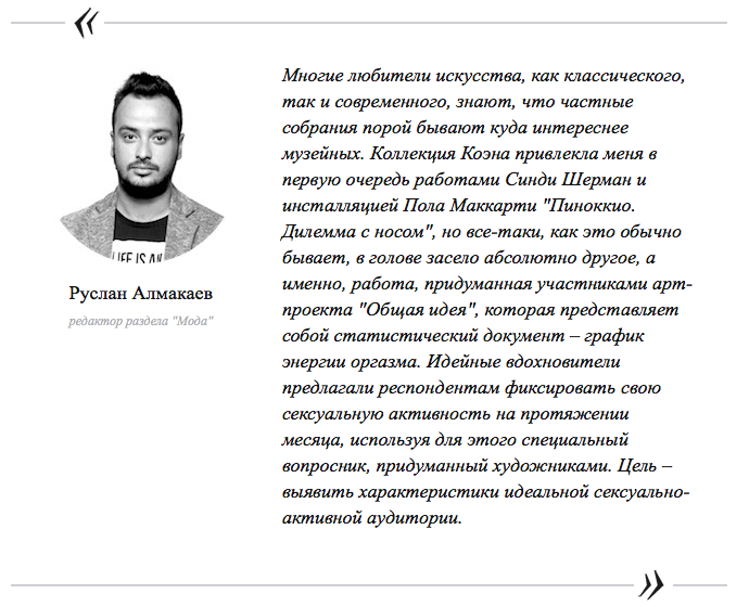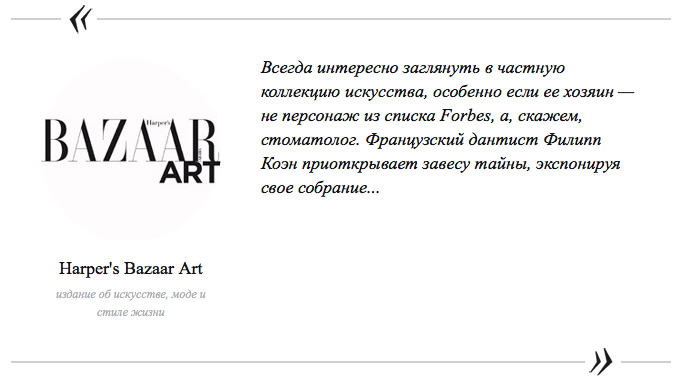 Стомалотолог Филипп Коэн — страстный коллекционер искусства. Глядя на два этажа Мультимедиа Арт Музея, заполненные произведениями из его собрания, диву даешься, где он хранит их в обычное время. И ведь выставленные Ольгой Свибловой работы — лишь малая часть коллекции. Сам Коэн при этом не принадлежит к числу меценатов из списков Forbes или Art Review, не известен широкой публике и редко показывает свои сокровища. Все эти факты только подогревают наш интерес к его персоне.