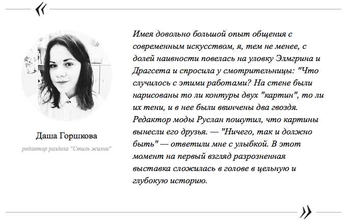 На третьем этаже ты увидишь работы Пола Маккарти, Филиппа Паррено (его ты, возможно, помнишь по крупной выставке в «Гараже», на которой он воссоздал звук, почерк и голос Мэрилин Монро), Альфреда Джаара, Шильпы Гупты и других современных художников. Они обыгрывают понятия света и тьмы, задумываются о свободе и изгнании, и видят жизнь как бесконечную цепь повторяющихся событий. Мы остались в восторге от выставки, потому что нашли те работы, которые лучше всего отражали наше внутреннее состояние. Надеемся, и ты найдешь в ней частицу себя.