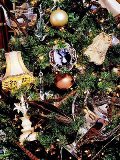 Винтаж. Этот способ очень любят в «домашних» европейских кафе и в огромных детских универмагах: на елку вешается все, что как будто бы достается с чердака. В качестве украшений подойдут и дорогие антикварные елочные игрушки из папье-маше, и старые плафоны, рваные стеклянные бусы, игрушки в виде овощей и фруктов, тряпичные куклы на бельевых прищепках, мандарины и конфеты и свечи. На верхушку можно посадить ангела или плюшевого мишку.