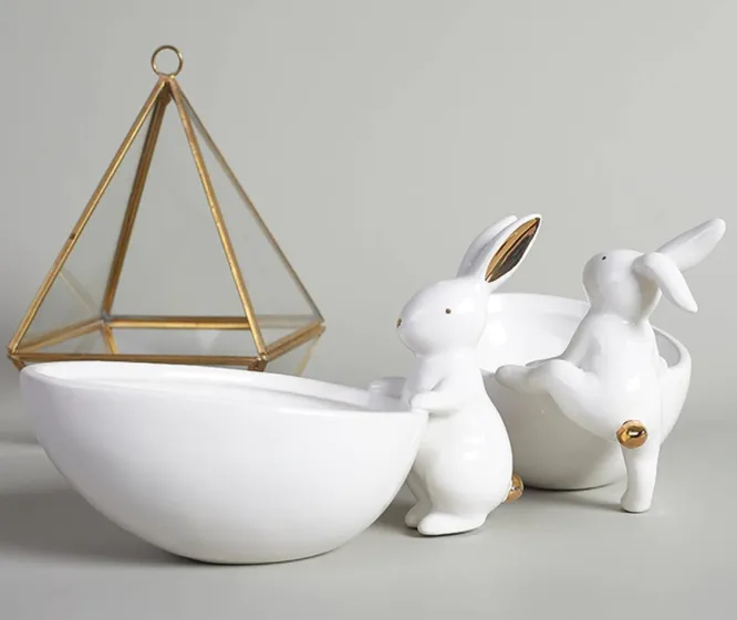 Белая керамическая подставка с кроликами органично впишется практически в любой интерьер.