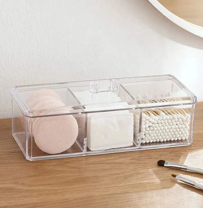 Ватные палочки, диски, матирующие салфетки, маски-таблетки, корейские маски-пирамидки и многие другие мелочи можно хранить в удобном прозрачном органайзере с тремя вместительными отделениями.