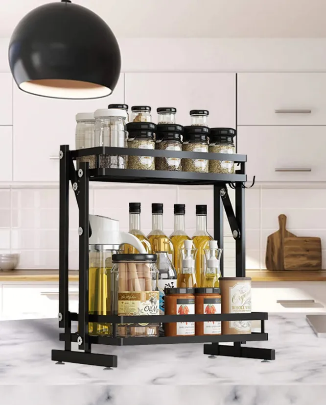 Стильный металлический органайзер подойдет как для кухни, так и для ванной. На нем можно аккуратно расставить специи или баночки с шампунями и гелями для душа.
