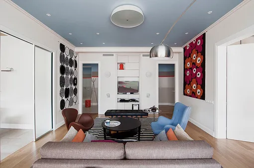 Если ты не готова перекрасить стены — добавь цвет на потолок. Или хотя бы на его часть.