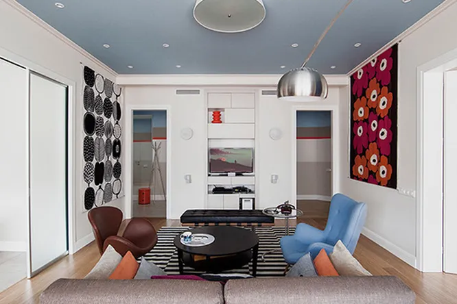 Если ты не готова перекрасить стены — добавь цвет на потолок. Или хотя бы на его часть.