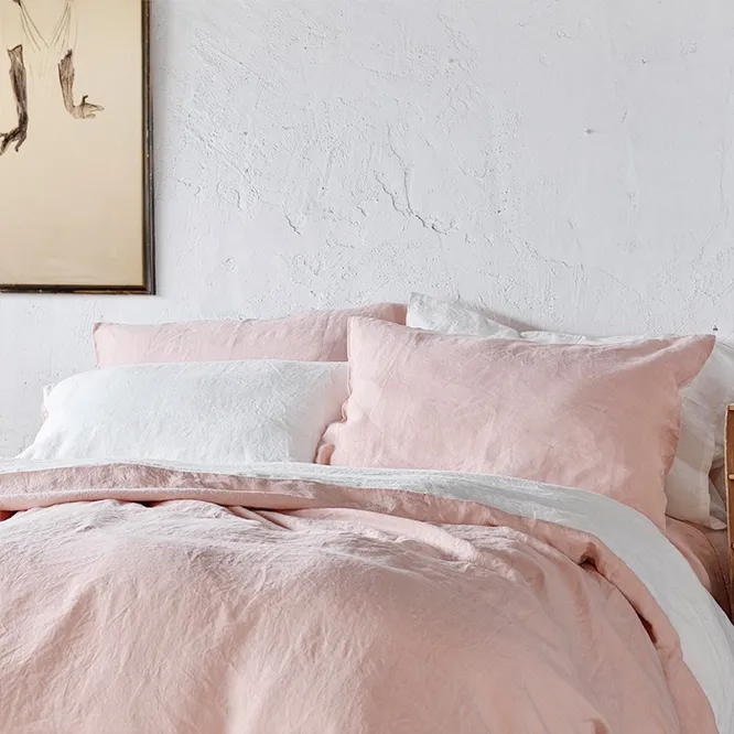 Дизайн. Комплект смотрится дорого и лаконично. Льняная ткань образует небольшие складочки, которые добавляют текстилю интересную фактуру. В комплекте сочетаются два нежных, приятных для глаз оттенка — белый и бледно-розовый. Такой текстиль отлично дополнит интерьер комнаты в стиле хюгге. Если ты не фанат кричащих дизайнов, то это вариант идеально подойдет для тебя.