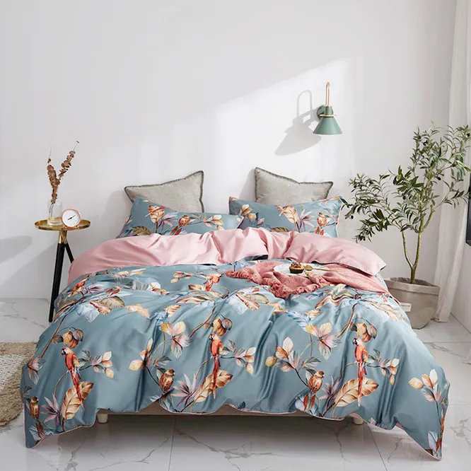 Дизайн. Основных цветов два. Внутренний — нежный розовый, внешний — серо-голубой, на котором изображены цветы, ветки и птицы. Комплект смотрится нежно и элегантно и отлично вписывается в классические интерьеры. Такое постельное белье станет ярким акцентом в твоей комнате и добавит атмосфере нотки романтики.
